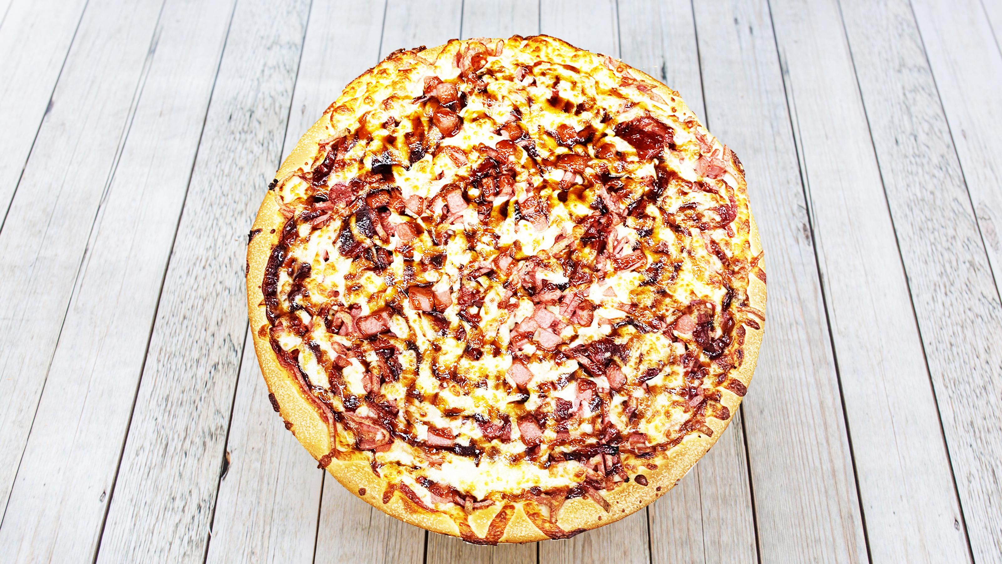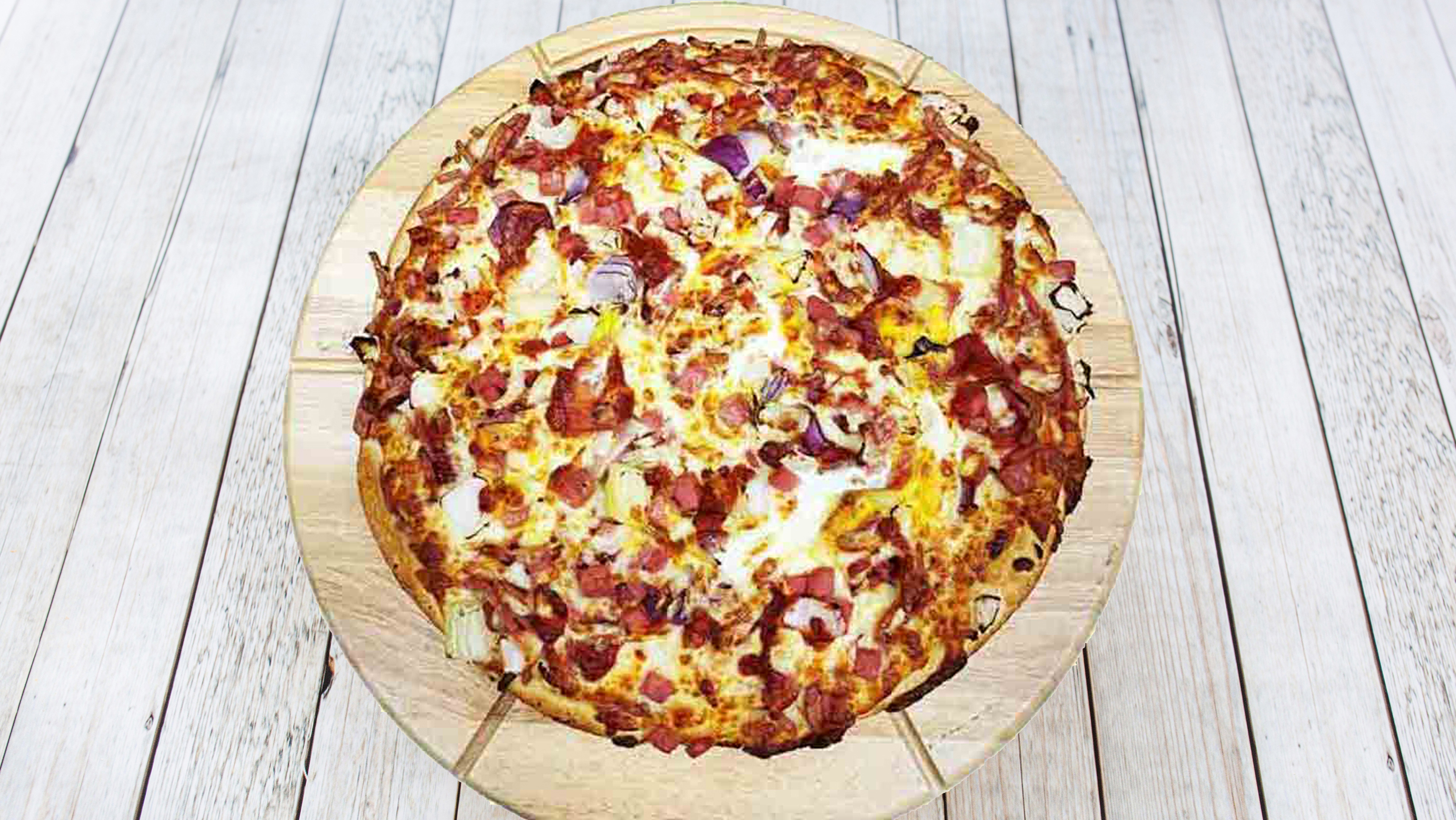 Tomato sauce, cheese, roasted lamb, capsicum, onion, and BBQ sauce or garlic sauce.