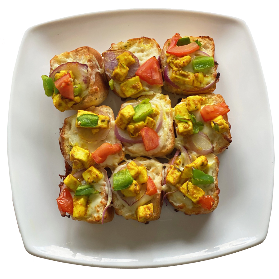 GARLIC BREAD PANEER$10.50Garlic bread, topped with stretchy mozzarella, Paneer, Cheese, onion, tomatoes, Capsicum.