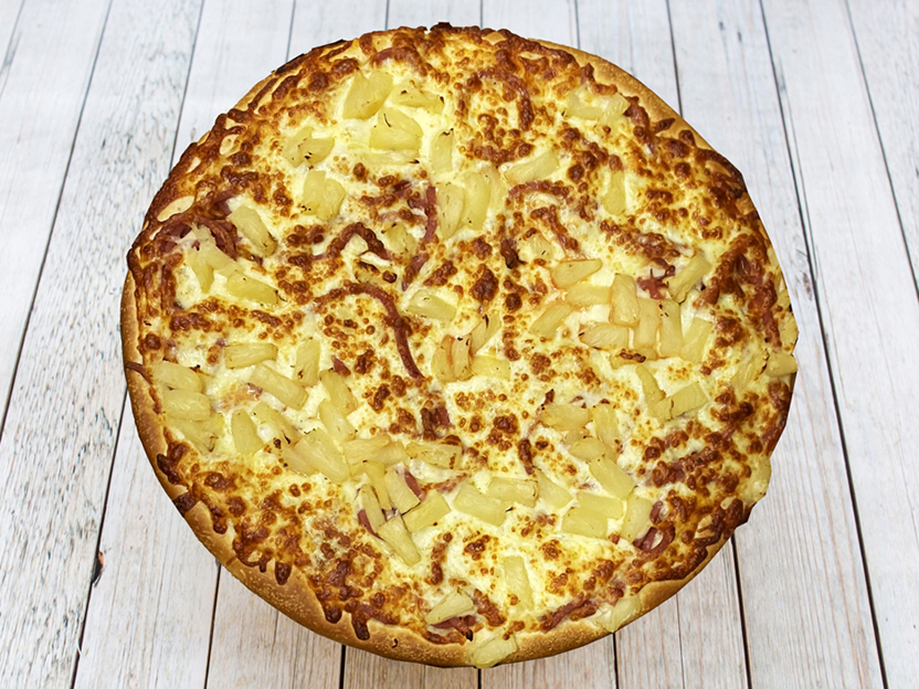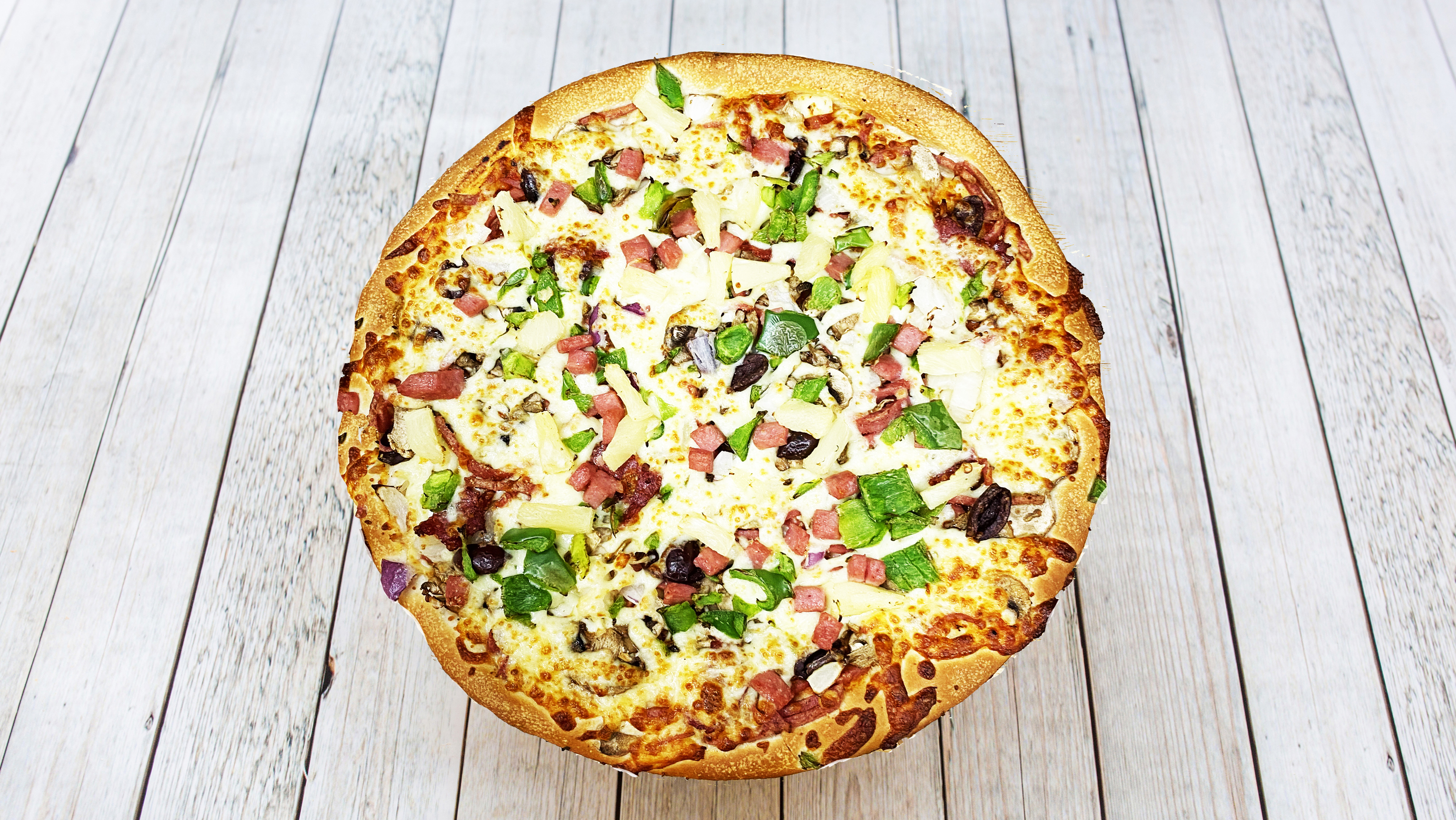 Tomato sauce, garlic, oregano, cheese, onion, shredded beef, olives, mushrooms, hot salami, capsicums, pineapple.