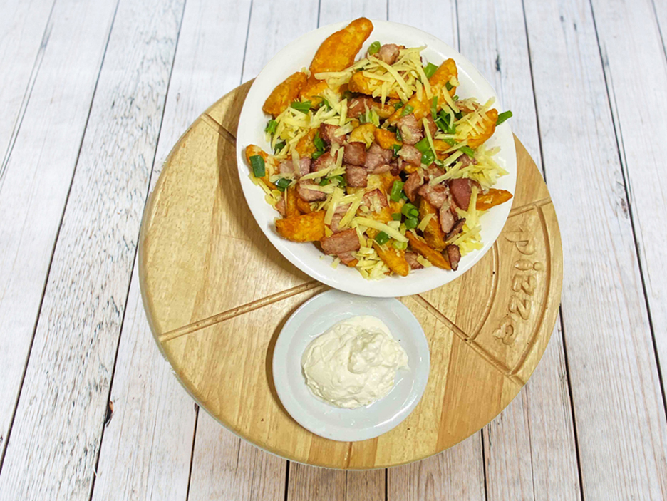 Potato wedges with crispy bacon, sour cream, spring onions and tasty cheese.0