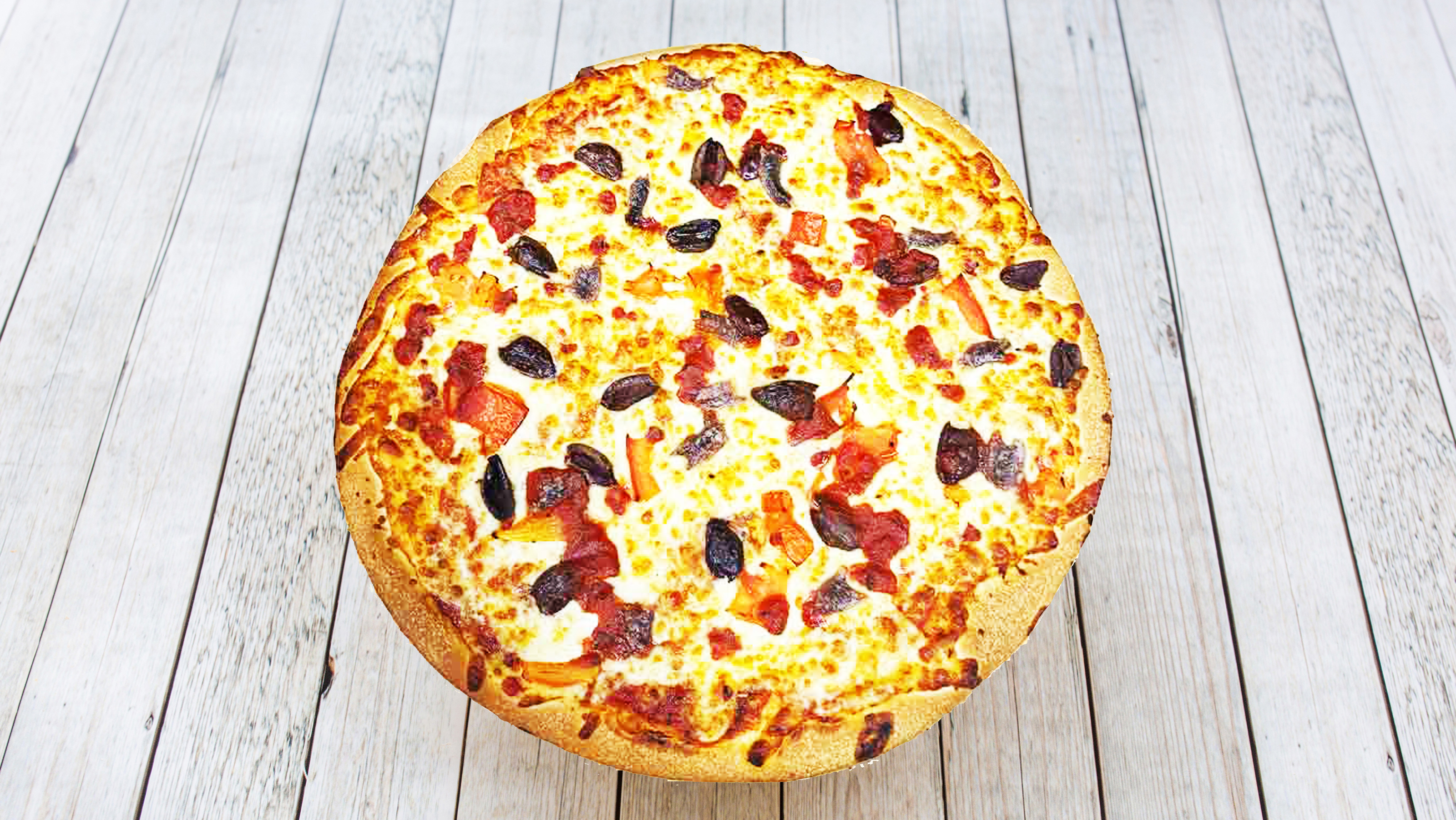 Tomato sauce, cheese, shredded beef, mushrooms,olives, capsicums.