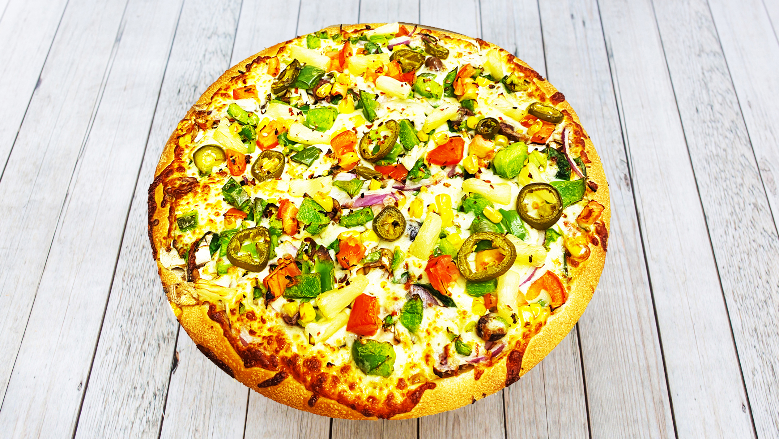 Cheese, mixed tomato and tamarind sauce, garlic, oregano, red onion, olives, fresh tomato, jalapenos, capsicum and paneer cheese.